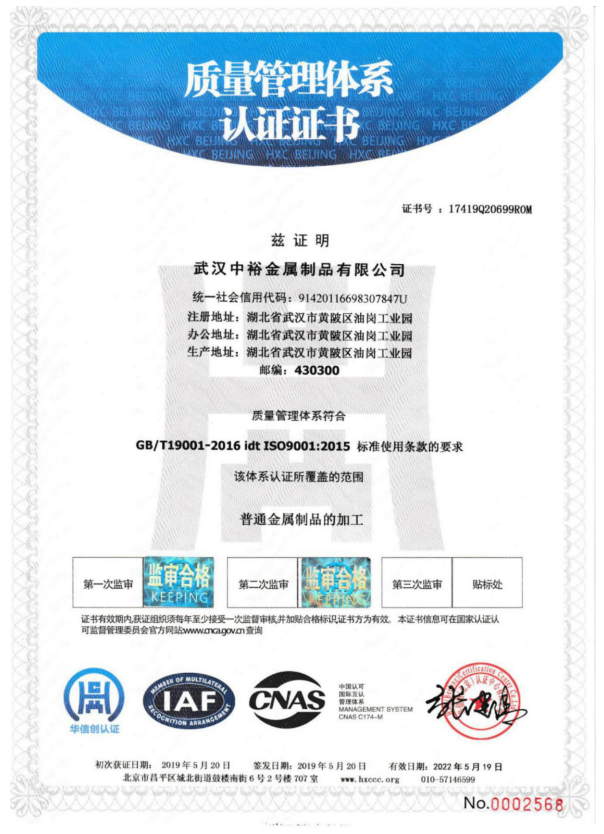 武漢中裕金屬制品有限公司(以下簡(jiǎn)稱(chēng)公司)成立于1996年8月,民營(yíng)私人獨(dú)資企業(yè)。2010年8月投資1800余萬(wàn)元,在前川油崗工業(yè)園征地20畝,新建5000平方米的生產(chǎn)車(chē)間和1100平方米的辦公大樓,2011年8月全部峻工投入使用。